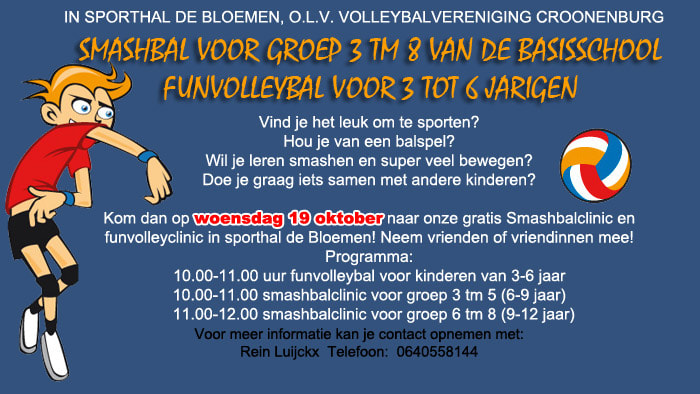 Op woensdag 19 oktober in sporthal de Bloemen vinden 3 clinics plaats. Van 10.00-11.00 uur hebben de funvolleyballers (3 tot 6 jarigen) hun clinic. Plezier en veel bewegen staat voorop. De basisschoolleerlingen van groep 3 tm 5 hebben van 10.00-11.00 uur hun smashbalclinic. De leerlingen van groep 6 tm 8 zijn van 11.00-12.00 uur aan de beurt. Bij de smashbalclinics leer je al meteen hard smashen en zal je veel bewegen.